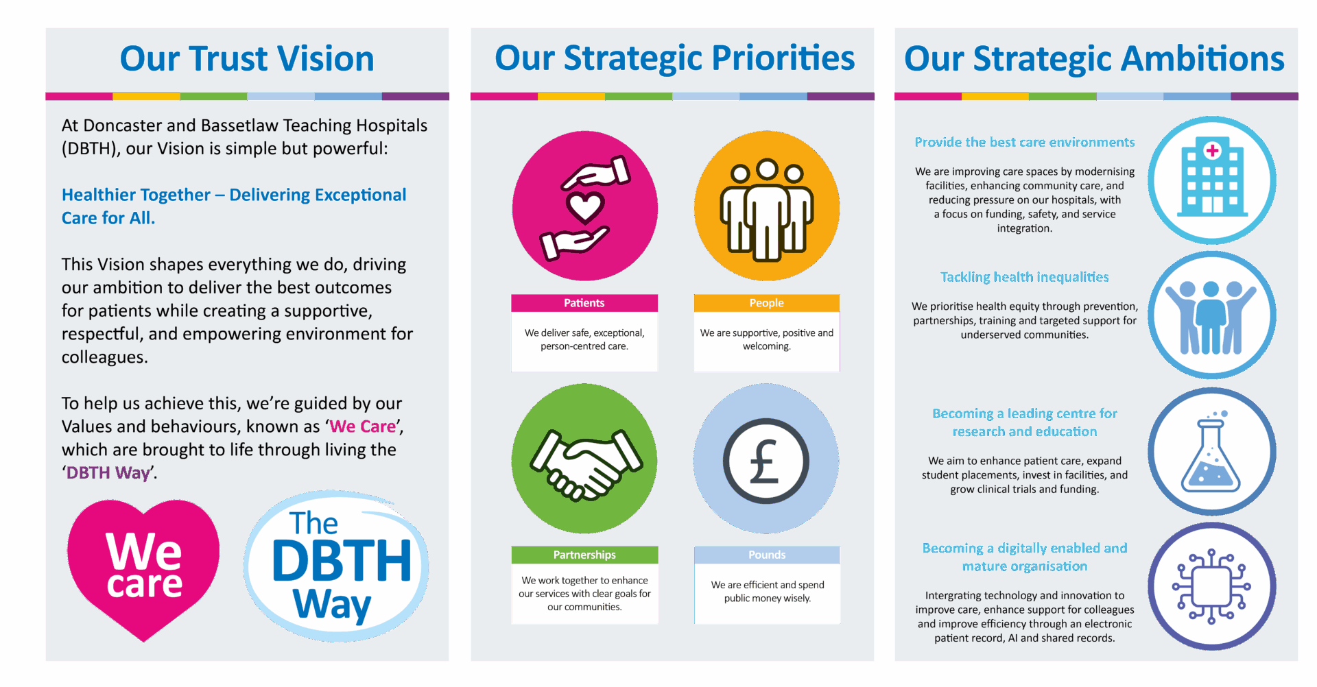 The strategy is shaped by our vision, underpinned by our values and The DBTH Way, and sets out four Strategic Priorities – Patients, People, Partnerships and Pounds – along with four Strategic Ambitions that guide our direction of travel.