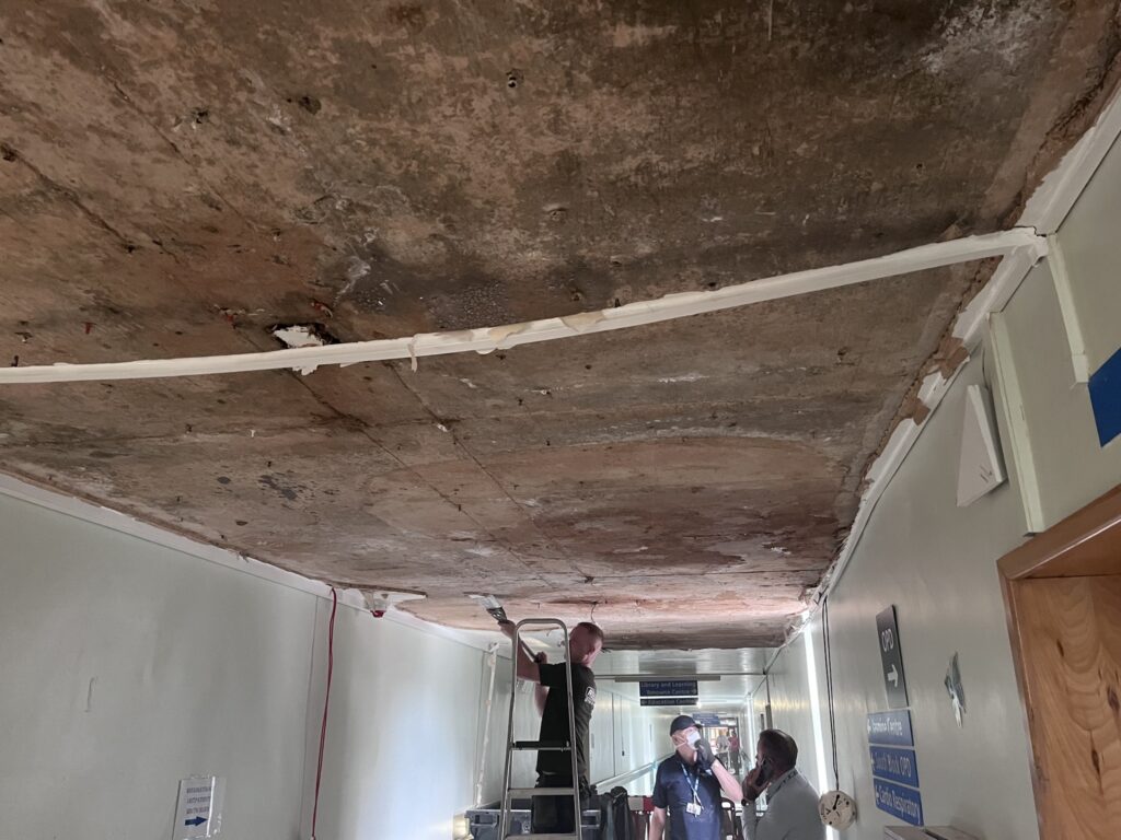 Unfortunately, a large section of plaster has fallen from the celling in the corridor which connects our Education Centre and Endoscopy at Doncaster Royal Infirmary. This is the result of leaks within the flat roof above, which have compounded over time (the area was built in the 1960s).