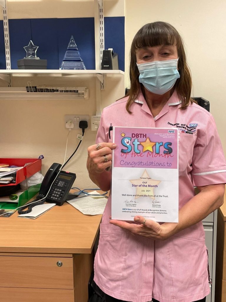 Sam Debbage, Deputy Director of Education and Registered Nurse at DBTH, nominated Teresa for the award, she said: “In a time when everything we have known has been thrown into the air, Teresa has been a light of stability. Calmly and quietly getting on with her job, but going above and beyond by ensuring anyone who comes into contact with her is checked on.
