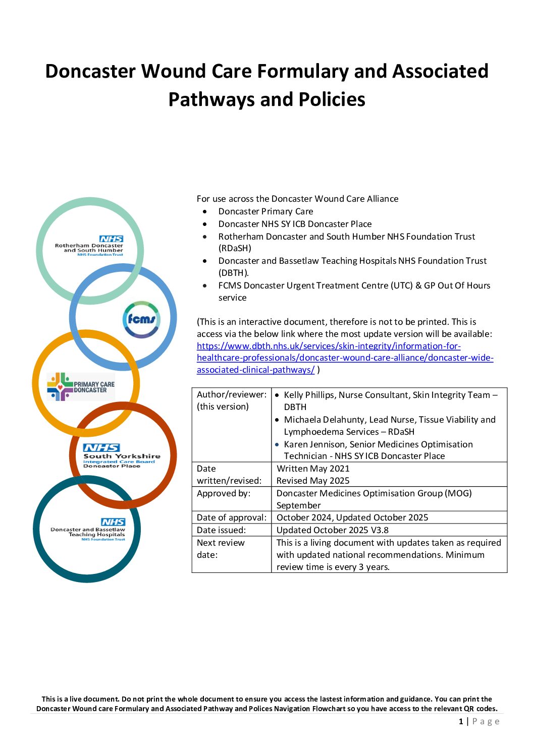 The Doncaster Wound Care Alliance appreciates the role that a joint wound care formulary and associated pathways and policies play to assist health practitioners in providing safe effective and economic products to service to people living with and at risk of developing a wound. It is important that any new or amended products are introduced in conjunction with the lead clinicians, Medicine Management and the Procurement Teams across the Doncaster Wound Care Alliance.